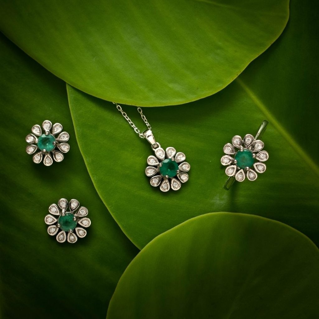 A look is not complete until the right accessories are added. This Silver full set studded with four gemstones of Brazilian Emeralds, surrounded by petals resembling an elegant Daisy flower is a great investment to making ‘HER’ feel beautiful. This piece would energize her to seize the day-shake the world and transform all her moments into unforgettable ones.