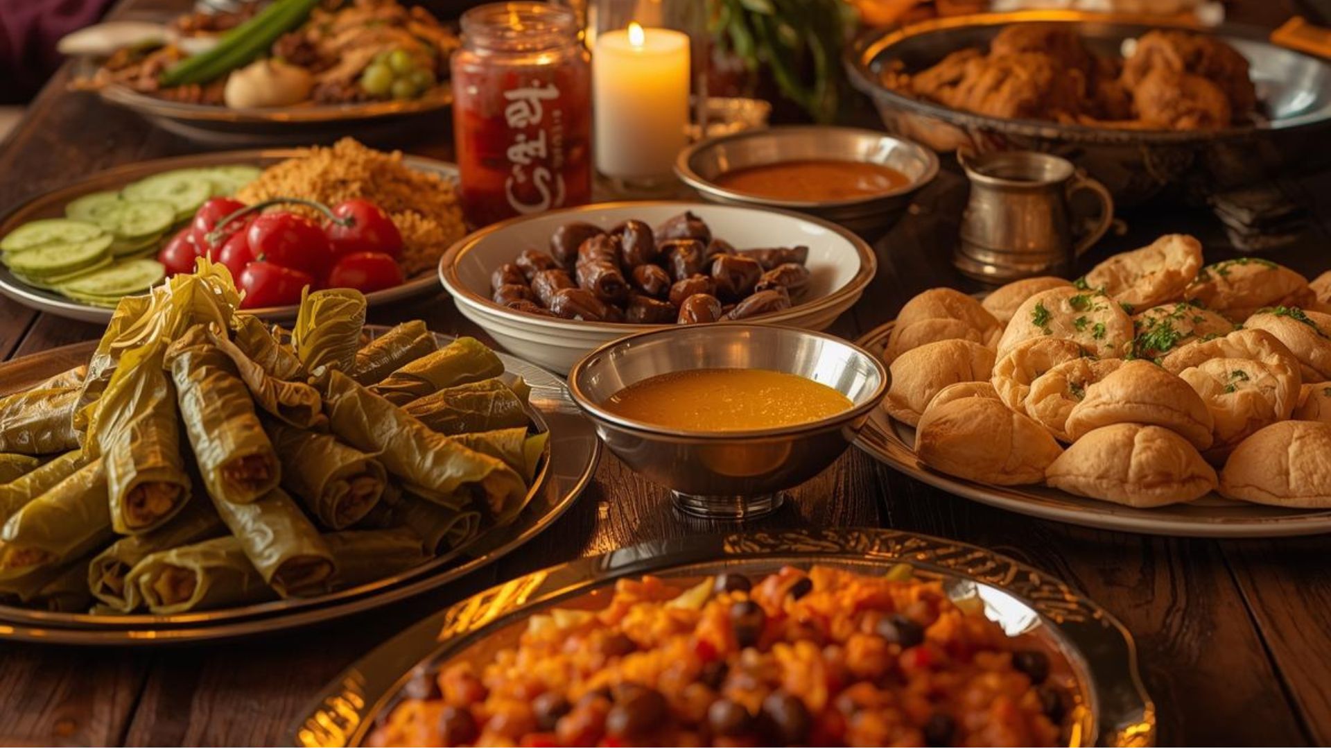 Details: Traditional Iftar spread including dates, refreshing beverages and festive main dishes.