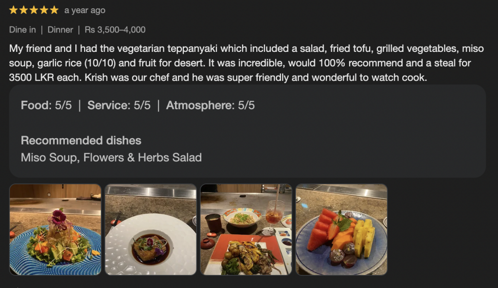 If you’re open to playful takes on Japanese classics, this is an elevated but approachable experience. Premium dishes hover around LKR 3,500, making it a mid-to-high-range option. Just skip the dessert if you’re keeping it light!
