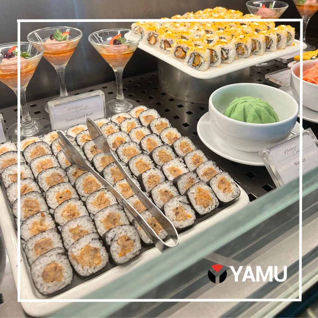 The sushi selection comprised tuna rolls, vegetable rolls, and tuna salad rolls. Despite the rice seeming a bit dry and our desire for more variety, the overall experience improved significantly after dipping it in soy sauce and pairing it with wasabi.