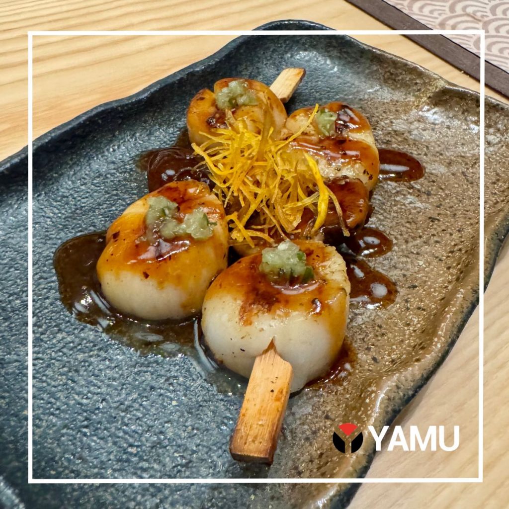 including chicken, beef, shrimp and octopus.  They are served on a skewer with your choice of sauce from Black Pepper Teriyaki, Shiro Goma and Spicy Miso.