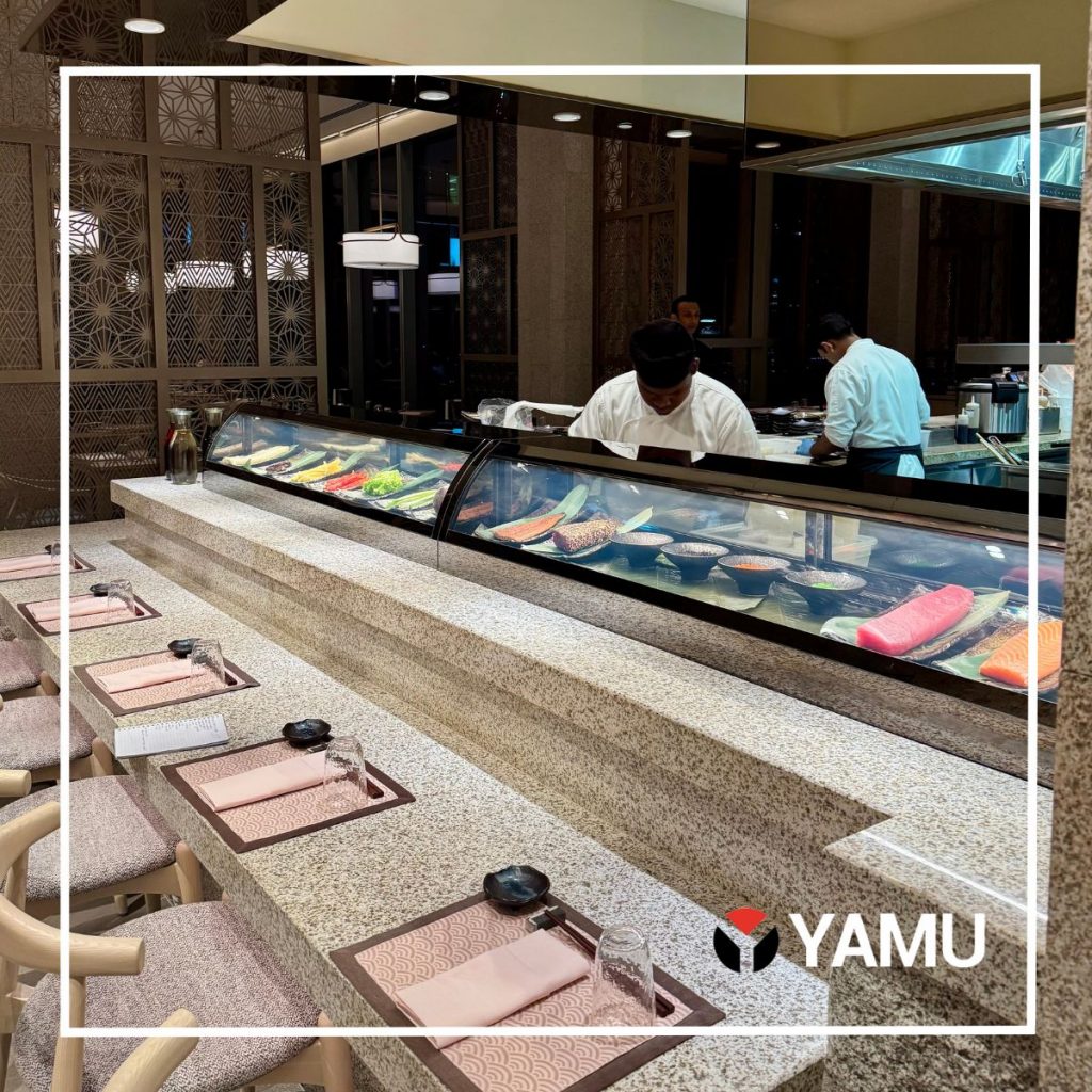 The restaurant’s architecture pays tribute to Japanese culture and history with every corner telling a story. There’s a quiet elegance to the space, with soft lighting, natural wood tones, and thoughtful decor that whisper culture and luxury without feeling over the top. This aesthetic is reflected in the tiniest details from the menu and cutlery to even the wet-wipes. Once you step inside, the restaurant is designed as a portal to the Land of the Rising Sun.